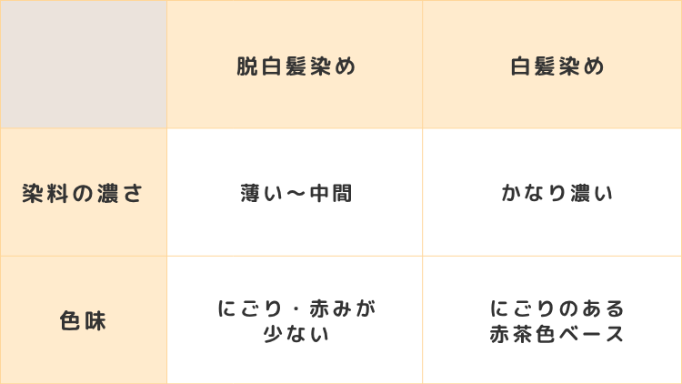 一方で、白髪染めは、白髪を完全にカバーするために濃い染料でできています。また、色持ちがいい赤茶色がベースカラーとなっているため、鮮やかさはほとんどありません。