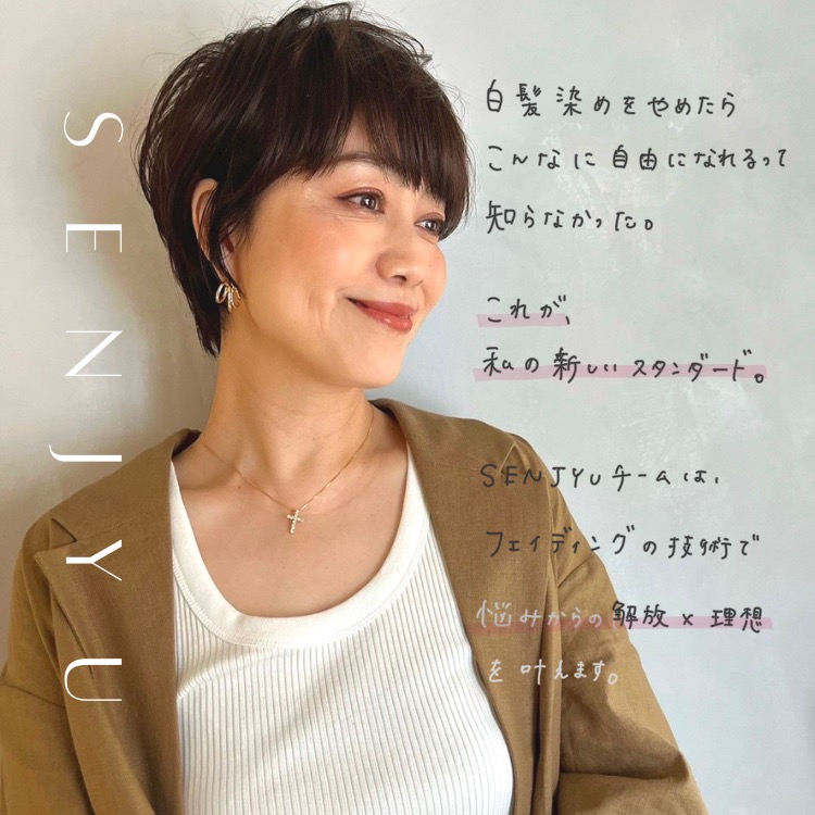 SENJYUチームでは、白髪悩みのある40代以降の女性に脱白髪染め(フェイディング)をおすすめしています。