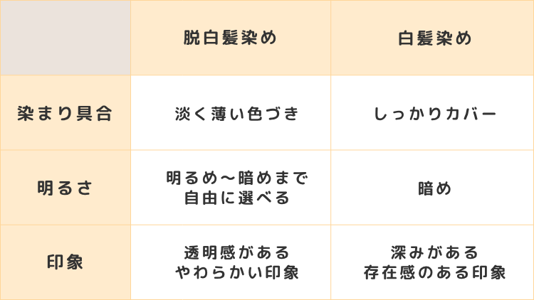 脱白髪染めと白髪染めは、仕上がりやメンテナンス頻度などさまざまな違いがあります。