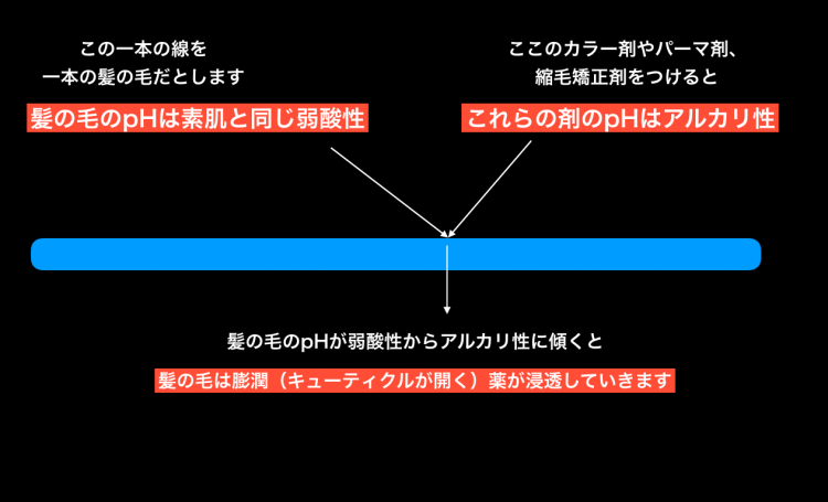 カラー剤、パーマ剤、縮毛矯正剤はアルカリ性です 弱酸性の髪の毛にアルカリ性の薬がつくと髪の毛は膨潤(キューティクルが開く)し、薬が髪の毛の中に浸透する訳です。