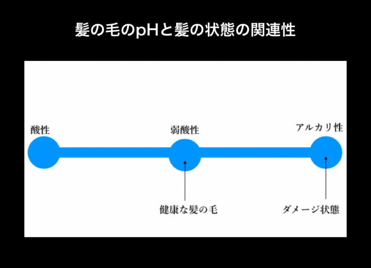 ↑上の図でもお分かり頂けると思いますが、 髪の毛が健康な状態が弱酸性の状態であり 何らかの原因でそのpH値が変わってしまうと不健康な状態に変わります。 つまり、髪の毛にとってこのpHとは最も大切な要素なのです。