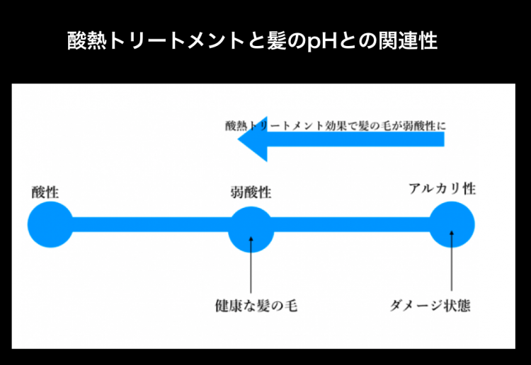 酸性のトリートメントと言う意味であり、髪の毛を酸性領域にするものです。 髪の毛のpHは元々、素肌と同じ弱酸性になります。 カラーや、パーマ、縮毛矯正をする事で髪の毛が傷んだように感じてしまうのは 実は髪の毛のpHが関係しています
