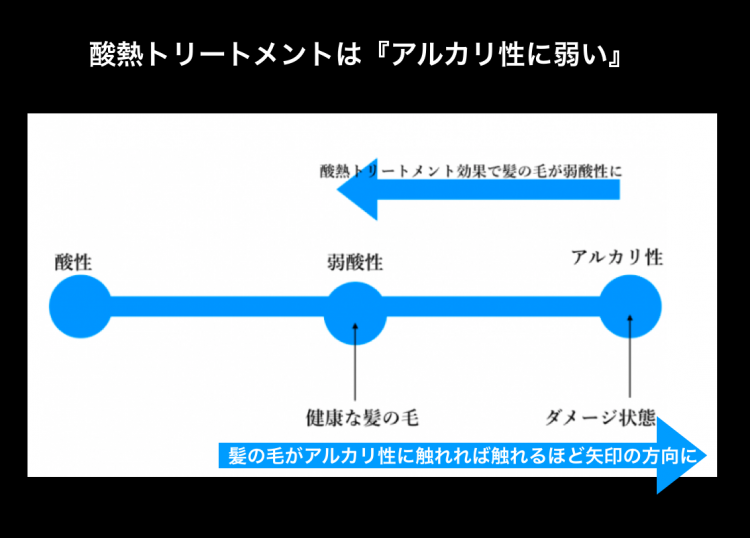 つまり、大切なのは髪の毛のpHを酸性領域で止める事 そのコルセットの役割を担うのが、酸熱トリートメント専用のシャンプー、トリートメントになります。