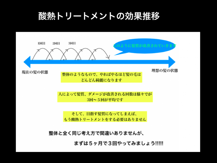 酸熱トリートメントに『持ち・持続』という概念は基本存在せず、髪の毛を徐々に綺麗にしていくものです。 例えるなら、『髪の毛の整体』です。 整体のように、繰り返し施術する事で、より効果が感じられます