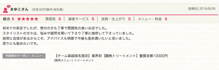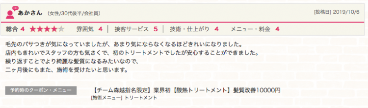 初めてこのトリートメントをしましたが今までしてきたトリートメントとはちがう感触でした。 そのあと1度自宅でも洗髪しましたがまだ保たれている気がします。 スタッフさんはみなさん感じの良い方たちで丁寧にしてくださりました。