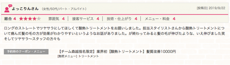 そうでしたか。それは残念です。同じ美容師としてお詫び申し上げます。ただ、冒頭にもご説明させて頂きましたが、酸熱トリートメントとは『技術』です。誰(どの美容師さん)がやっても成功するものではありません。パーマやカット、カラーと同じように、担当してくださる美容師さんの知識、経験、技術力により、その効果は大きく変わりますし、失敗もあります。今の時代、重要なのは美容室選びではなく『美容師選び』なんです。