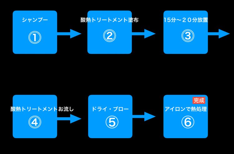 工程として、酸熱トリートメントは主成分の酸性の力と熱の力を使い、 髪の毛にトリートメントを定着させ、髪の毛を美髪へと導きます。