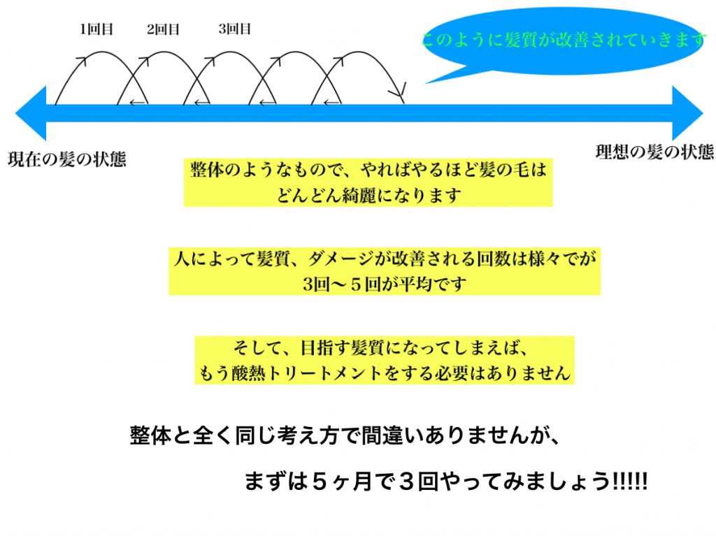1回でも十分な効果は発揮しますが、髪質やダメージ、つまり見た目を直していくにはお時間はかかります