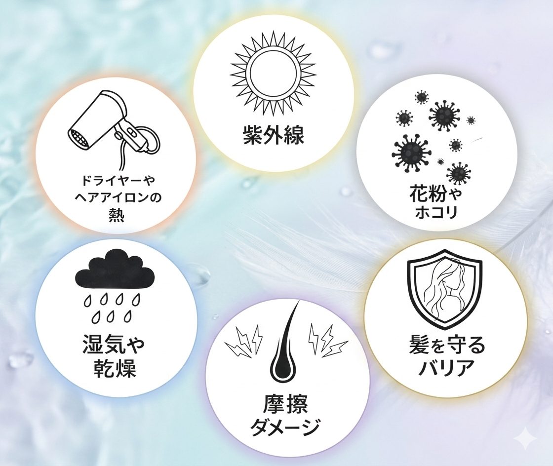 ヘアアイロンやドライヤーの熱、紫外線、摩擦などを完全に防ぐことはできません。
