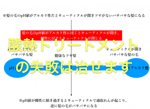 今話題の酸熱トリートメント。 とっても素晴らしい技術であると、話題沸騰中ではありますが、 良いものには必ずつきものなのが、『失敗』の事例です。 酸熱トリートメントをして髪が痛んでしま..